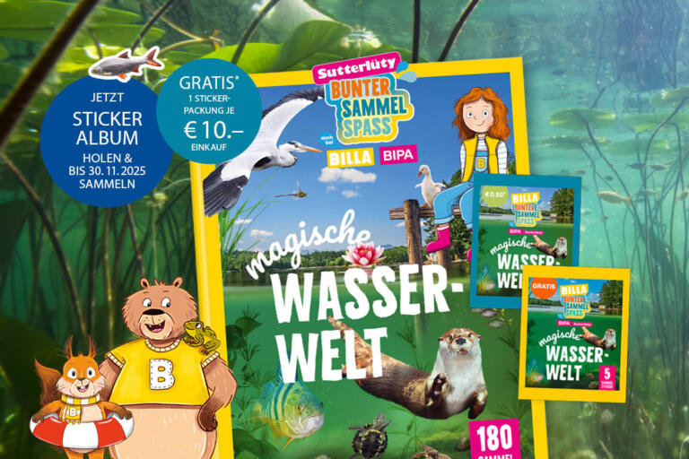 Mit Billi, Bella und Ben erkunden wir das Wasser und laden dich gemeinsam mit BILLA und BIPA in eine b’sundrig schöne Unterwasserwelt ein – voller bunter Bilder, spannender Infos über das Leben im und am Wasser, kniffliger Rätsel, faszinierender Sagen sowie magischer Sammelsticker.