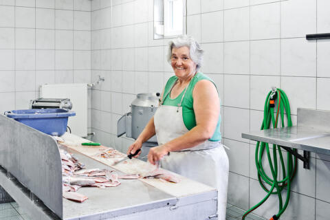 Sobald die beiden wieder festen Boden unter den Füßen haben heißt es für Regula erst recht: Volle Kraft voraus. Denn die Fische wollen für den Verkauf vorbereitet werden. Da heißt es schuppen, ausnehmen, waschen, filetieren – und dann steht meistens auch schon der Kühlwagen für Sutterlüty vor der Tür.