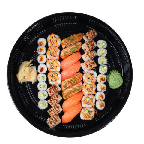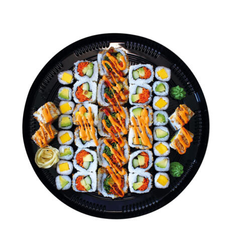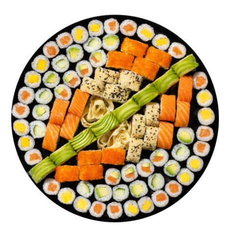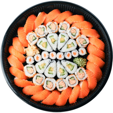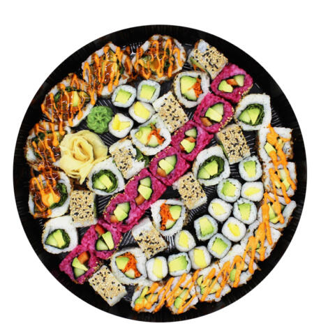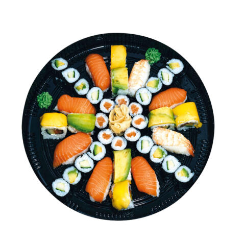 60 Stück für 4–5 Personen: 15 Nigiri Lachs, 10 Maki Lachs, 10 Maki Gurke (vegan), 20 Futo Lachs Avocado, 5 Nigiri Ebi