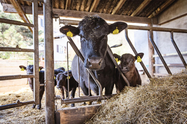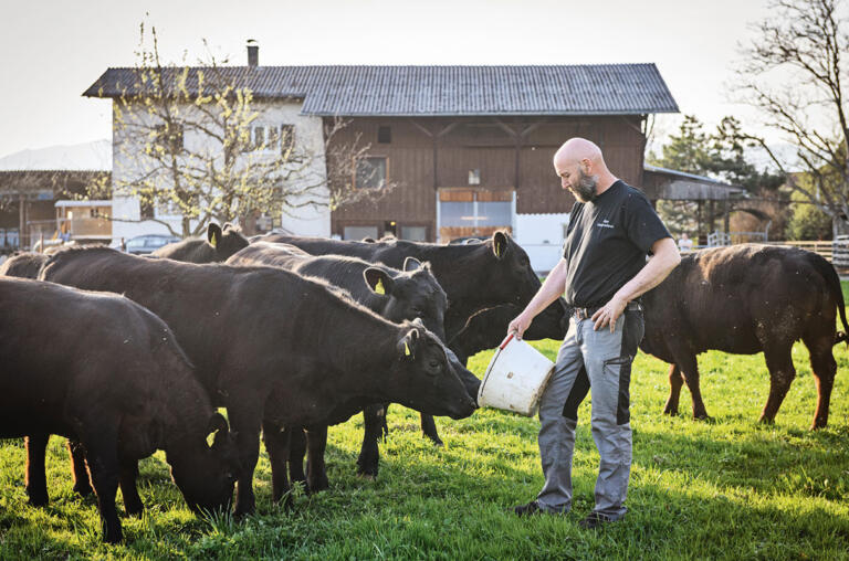 „In den Neunzigerjahren war das hier ein Milchbetrieb, da war das mit den Kälbern natürlich auch noch anders“, sagt Reinhold und lässt den Blick über das gute Dutzend Kälber gleiten, die neugierig hinter den Muttertieren hervorlugen. Eine einjährige Auszeit in den USA hat den Koblacher zum ersten Mal auf den Gedanken gebracht, irgendwann einmal von der Milchproduktion auf die Rinderzucht umzusatteln. „In Amerika habe ich gelernt, was ein gutes Steak und was ein anständiges Fleisch ist. So etwas, habe ich mir damals gedacht, fehlt bei uns.“Zurück im Ländle führte dann das Schicksal früher als gedacht dazu, dass dieser Gedanke konkrete Formen annahm: IBR, eine Virus- Erkrankung, zwang den damaligen Milchbauern, alle Milchkühe zum Schlachter zu bringen. „Da habe ich mich entschieden, auf Rinderzucht umzustellen.“ Obwohl es weitaus wirtschaftlichere Rassen gäbe, sind für Reinhold schon damals nur zwei Rassen in Frage gekommen: Angus und Hereford. Schlussendlich fiel seine Wahl auf Angus, von denen derzeit 42 Stück am Hof leben.
