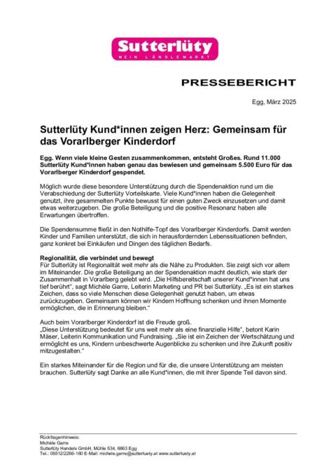 Sutterlüty setzt auch 2025 sein soziales Engagement fort und unterstützt das Vorarlberger Kinderdorf mit einer großzügigen Spende. Damit bleibt das Unternehmen aus dem Bregenzerwald seiner Überzeugung treu, regionale Hilfsorganisationen zu stärken und benachteiligten Familien in Vorarlberg zur Seite zu stehen.