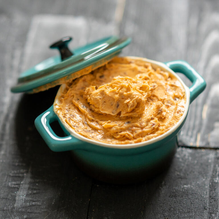 Die weiche, zimmerwarme Butter gibt man in eine Schüssel und rührt sie cremig. Dann werden die Speckstücke, etwas vom Bratensaft und Honig zur Butter gegeben und ordentlich durchrühren. Anschließend würzt man die Mischung mit geräuchertem Paprikapulver, frisch gemahlenem Pfeffer, etwas Chili und einer kleinen Prise Salz.
