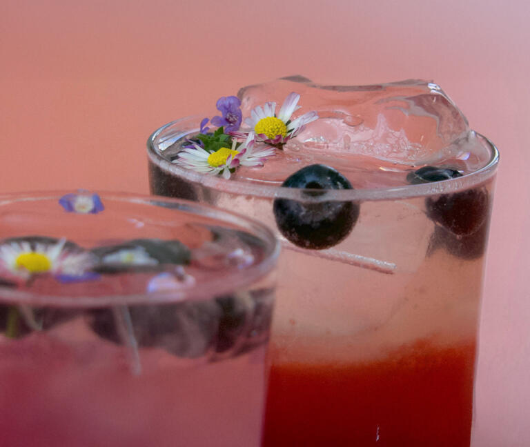 Beeren und Johannisbeersirup mit dem Stabmixer fein pürieren. Das Püree durch ein feines Sieb direkt ins Glas streichen, damit keine Kerne oder Fruchtstücke zurückbleiben. Eiswürfel ins Glas geben. Kombucha Dirndl und einen Schuss Mineralwasser langsam und über einen Löffelrücken ins Glas gießen, um schöne Schichten zu erzeugen. Mit frischen Beeren und essbaren Blüten garnieren und genießen!