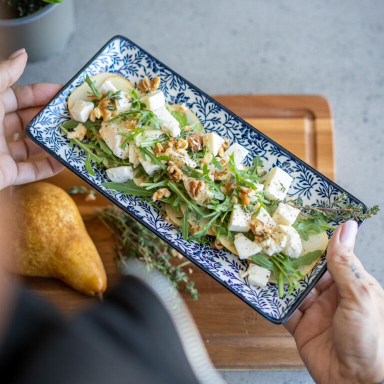 Birnen mit einem Gemüsehobel oder scharfen Messer in dünne Scheiben schneiden, auf flache Teller auslegen und mit etwas Vinaigrette beträufeln. Handvoll Rucola auf die Teller über die Birnenscheiben verteilen, gefolgt vom gewürfelten Mozzarella und grob gehackten Walnüssen. Darüber wieder etwas Vinaigrette und ein paar Thymian darauf verteilen.