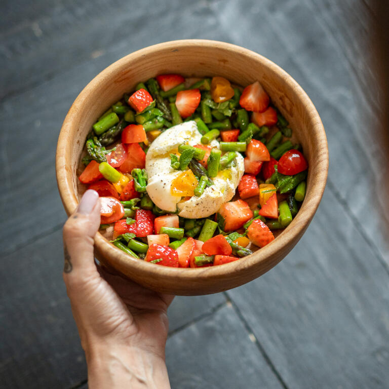 Währenddessen werden Erdbeeren, Tomaten und Spargel gründlich gewaschen. Die Erdbeeren und Tomaten halbiert man anschließend, während beim Spargel zunächst die holzigen Enden entfernt werden, bevor er in grobe Stücke geschnitten und in einer Pfanne etwas angebraten wird. Das vorbereitete Obst und lauwarme Gemüse wird mit der Vinaigrette vermengt, sodass sich die Aromen gut verbinden, und anschließend auf Tellern angerichtet.