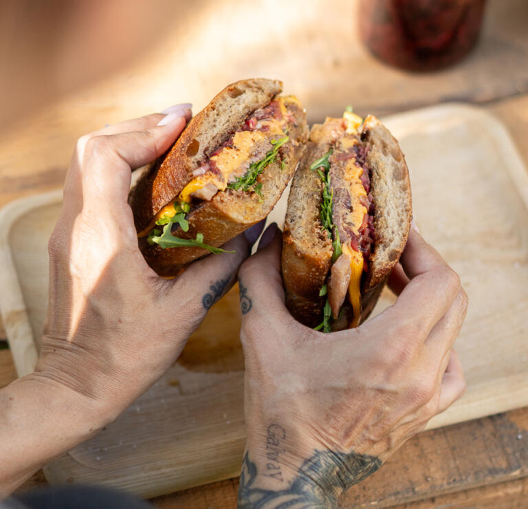 Währenddessen das aufgeschnittene Wurzelbrot auf dem Grillrost knusprig rösten und beide Hälften großzügig mit Bacon Butter bestreichen. Auf die untere Hälfte etwas Rucola geben, darauf die in Scheiben geschnittene Beiried legen und mit Salz und frisch gemahlenem Pfeffer würzen. Die Cheddar-Scheiben darauflegen und mit einem Bunsenbrenner leicht schmelzen, bis der Käse schön verläuft.