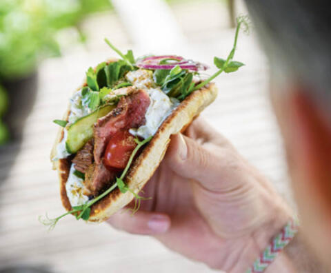 Pfannenbrot mit Steakstreifen, Tsatsiki & allerlei Gemüse