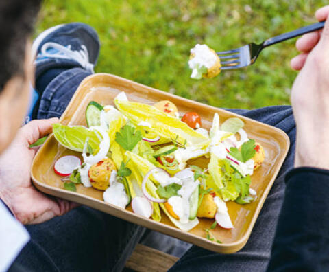 Pikante Kichererbsen-Bällchen mit Salatherzen und Bergkäse-Joghurt-Dressing