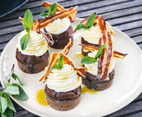 Schokolade-Muffins mit Bacon-Frischkäse-Creme und Ahornsirup
