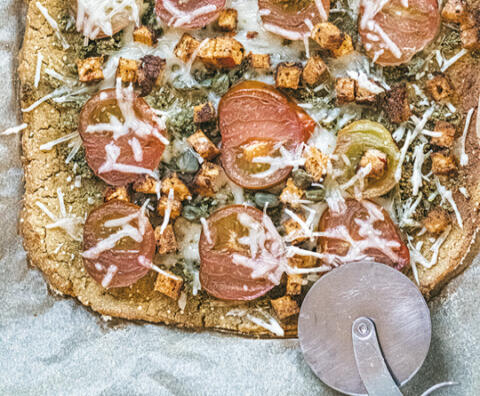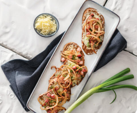 Bio-Bauernkruste mit Knöpflekäs, Speck & Röstzwiebeln