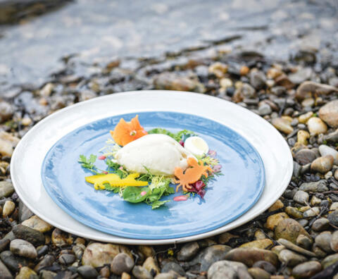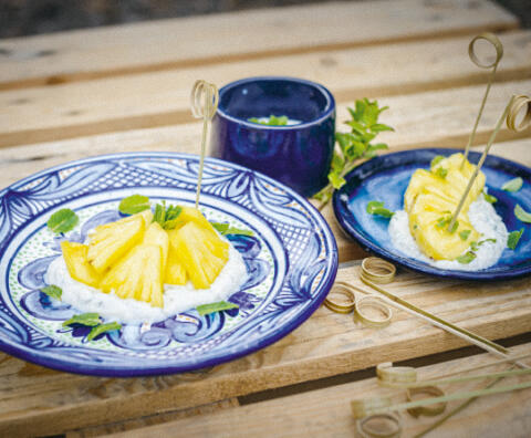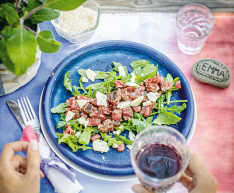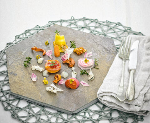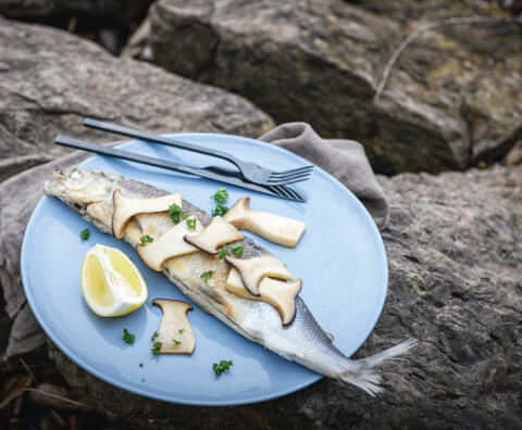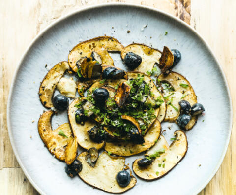 Pilz-Carpaccio mit Knoblauch, Petersilie und Heidelbeeren