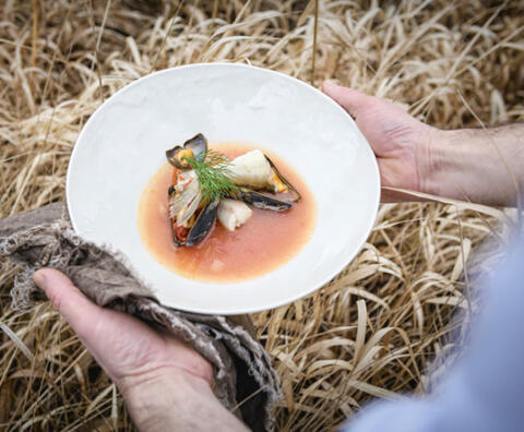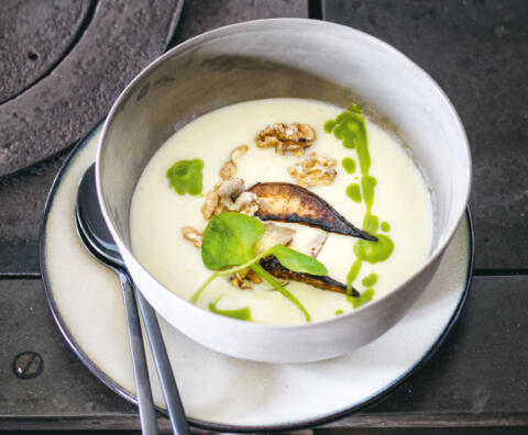 Topinambur-Sellerie-Süppchen mit salziger Birne, Walnüssen und Portulak-Öl