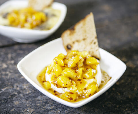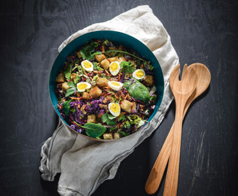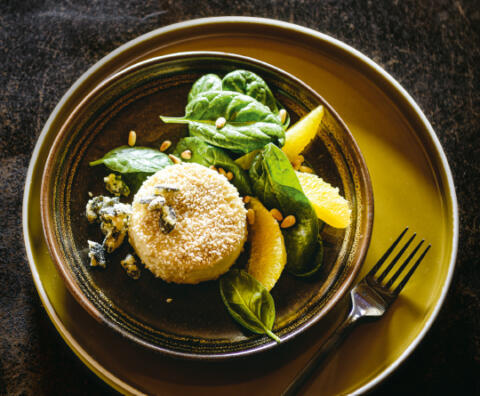 Ziegenkäse mit Honig-Sesamkruste, Orangen-Spinatsalat und Kürbiskernkrokant