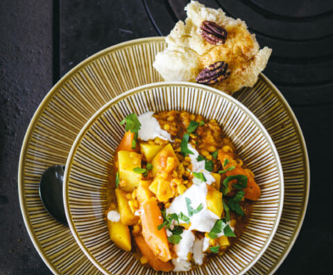 Orientalisches Stew mit Wintergemüse, roten Linsen und Limettenjoghurt