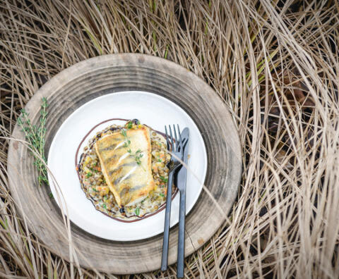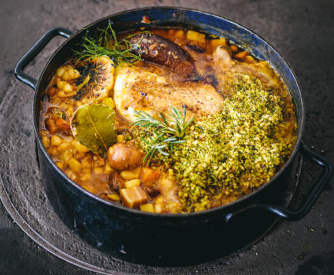 Cassoulet vom Wälderhennele, weiße Bohnen, Speck, Salsiccia, Kräuterkruste