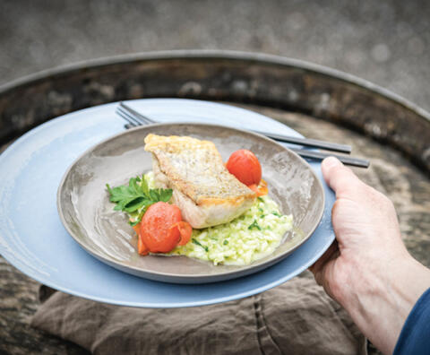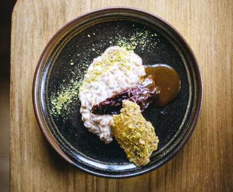 Dinkel-Milchreis mit eingelegter Dörrbirne, Salzkaramell und Pistazienkräcker