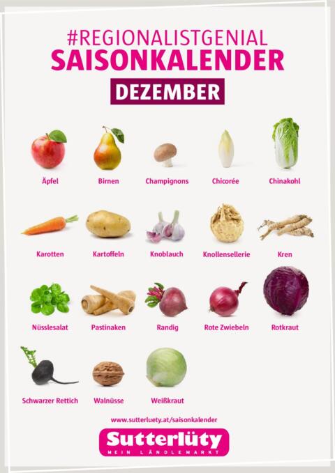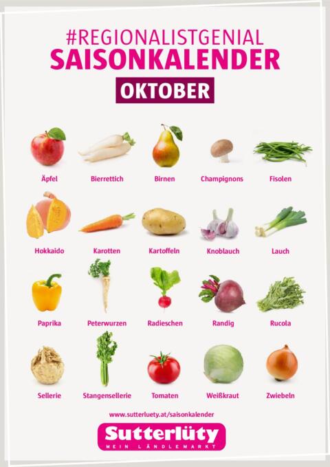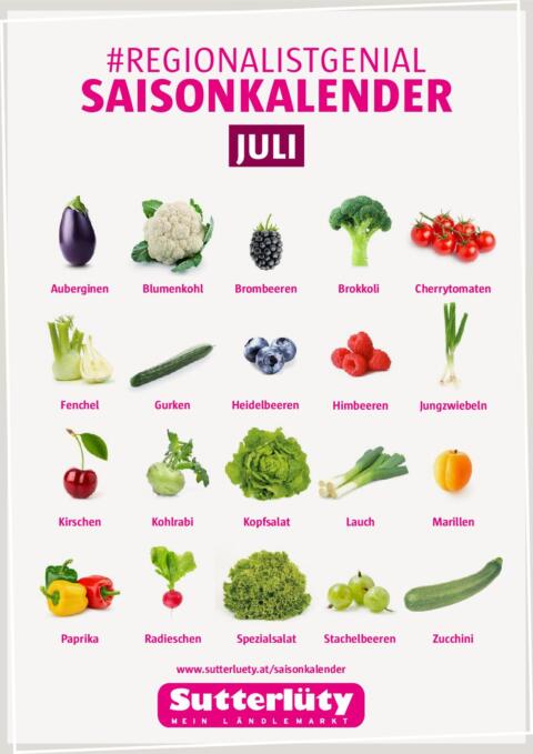 Obst und Gemüse soll frisch sein – genau dann ist es nämlich auch richtig gschmackig und sowieso gesund. Aber was hat in Österreich aktuell Saison und was gibt es gerade frisch? Der Sutterlüty’s Saisonkalender bietet jeden Monat eine wunderbare Übersicht darüber, welche heimischen Produkte gerade geerntet werden und somit verfügbar sind. Übrigens sind saisonale Lebensmittel nicht nur gesünder, sondern auch noch meist günstiger und schonender für unsere Umwelt!